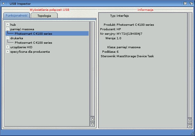 Opisywany produkt wyposażony jest w interfejs USB. Po podłączeniu kabla do Amigi USBInspector natychmiast wykrył urządzenie w dwóch kategoriach. Pierwszym z nich była drukarka, drugim pamięć masowa, gdyż do urządzenia włożyłem kartę pamięci (której ikona automatycznie pojawiła się na blacie WB informując o pojawieniu się nowego volumenu). Niestety o ile system sam z siebie jest w stanie wykorzystać funkcje czytnika pamięci, o tyle, funkcja drukarki pozostaje na początku niedostępna. Aby to zmienić należy pobrać ten sterownik.